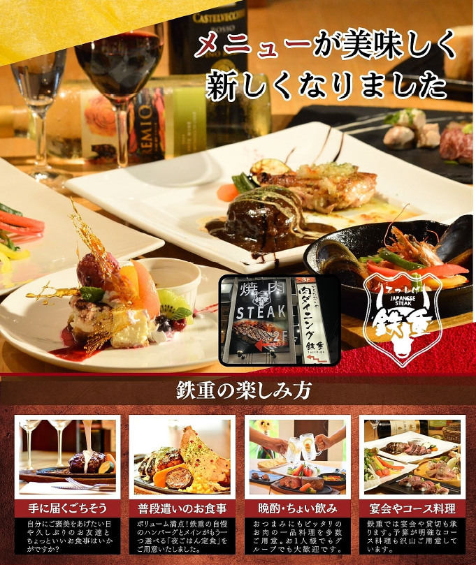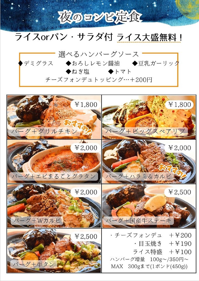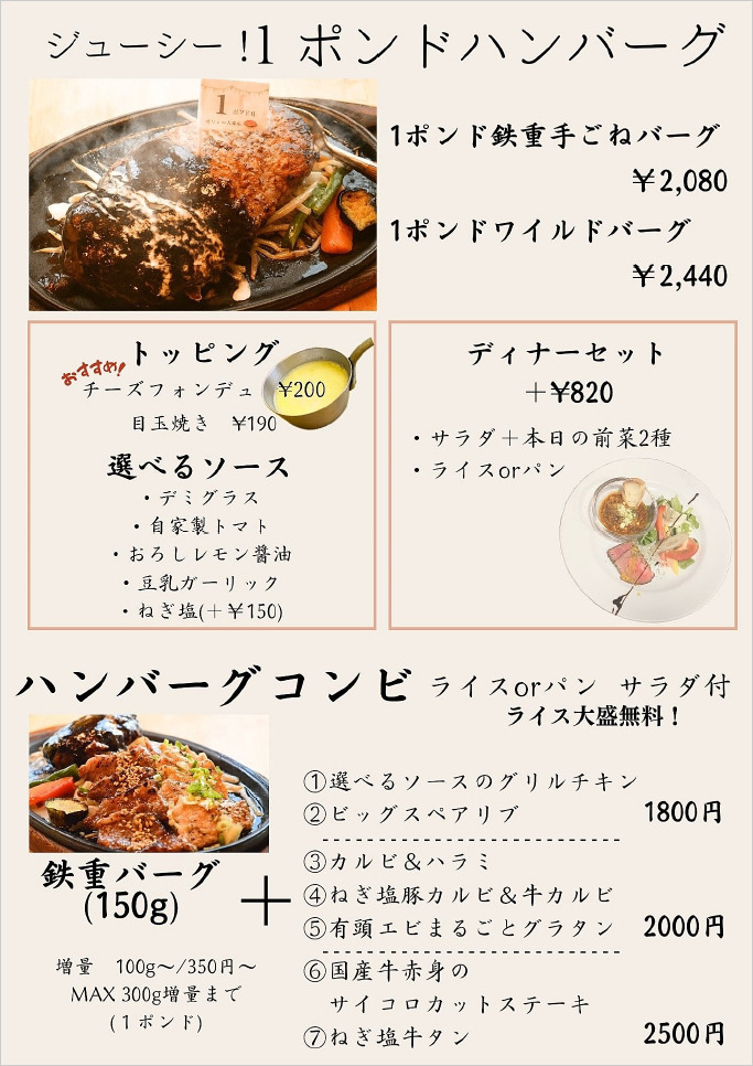 鉄重バーグ1,200円、ワイルドバーグ1,500円などで、