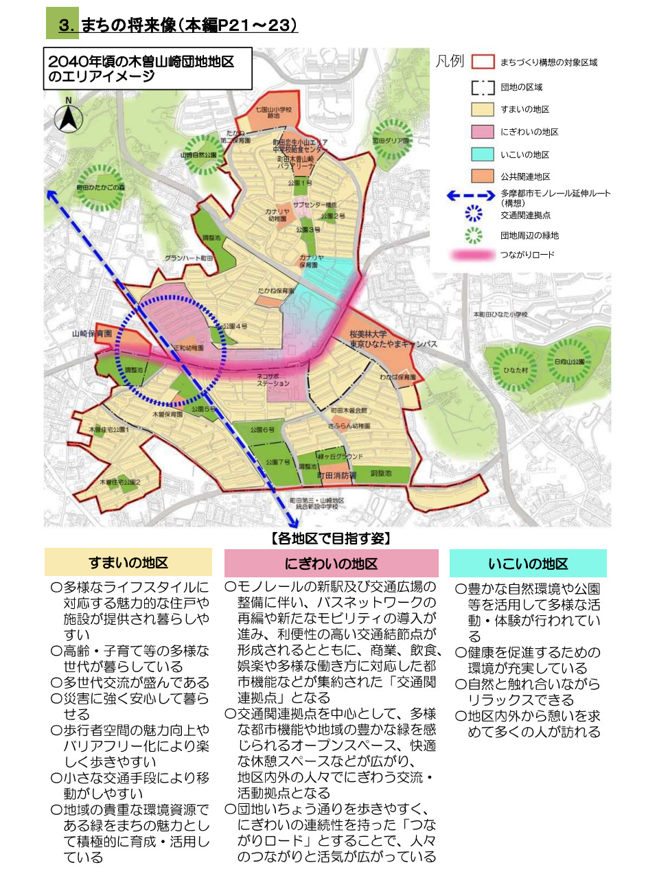 2040年頃の多摩都市モノレール延伸を見据えたまちづくり構想の改定を検討しており、