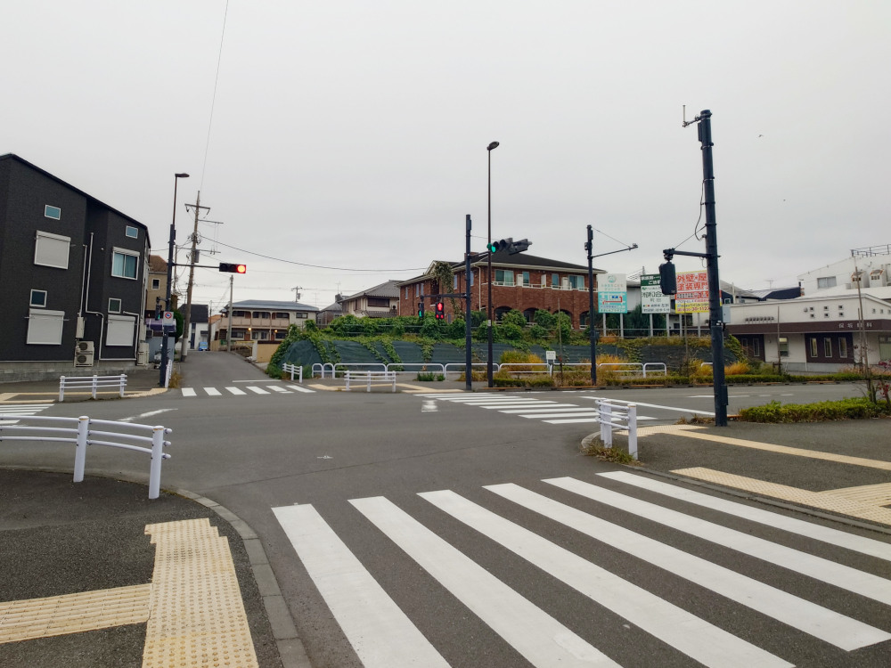 <写真>体育館前バス停付近の十字路(左:横浜方面、右:八王子方面)