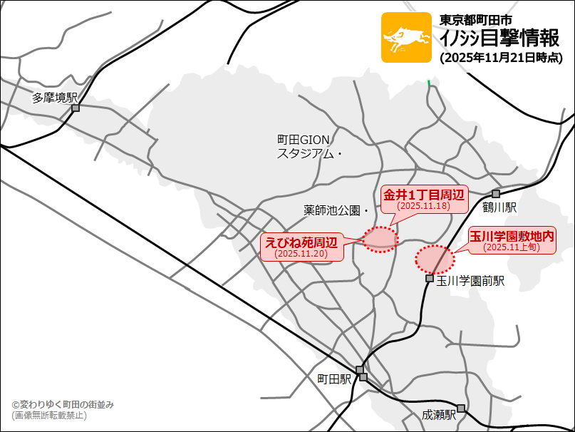 金井や本町田は多摩丘陵、そのまま高尾山方面から森が続いていいますから、イノシシが表れることは不思議ではないんですよね。