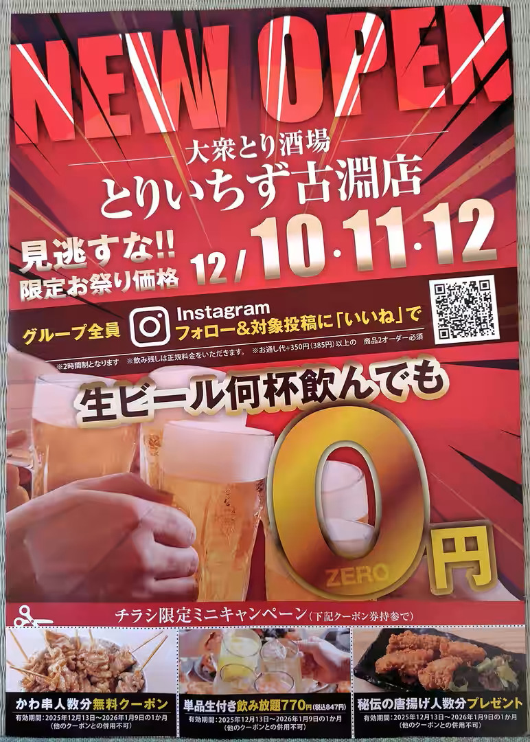 居酒屋「大衆とり酒場 とりいちず 古淵店」が、2025年12月10日(水)にオープンします。