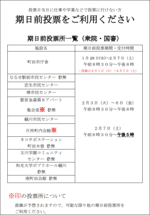 町田市内の「期日前投票」は、市庁舎(市役所)で2026年1月28日(水)から先行して開始し、