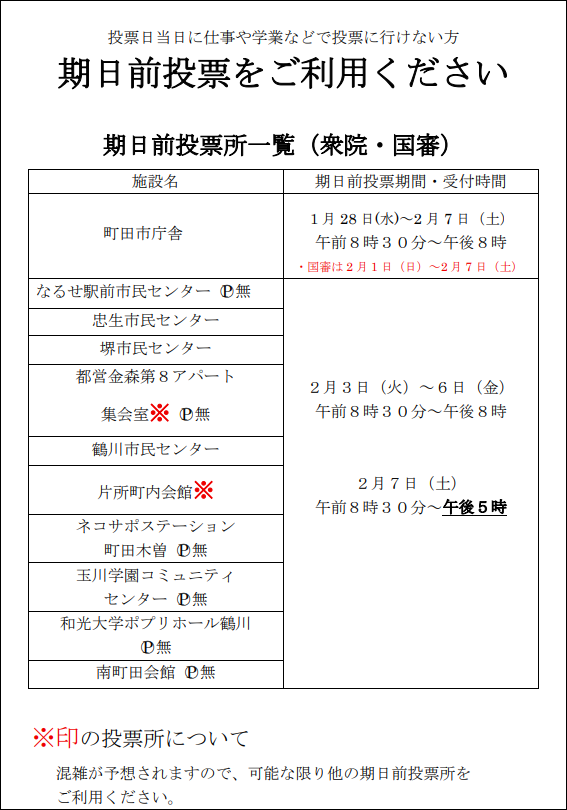 [衆議院議員選挙] 1月28日(水)~2月7日(土) 8:30~20:00 ※土日も投票可