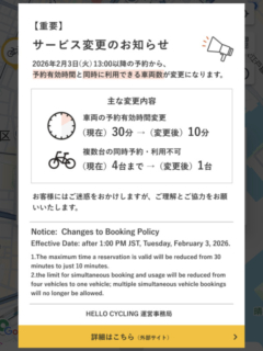 シェアサイクル「HELLO CYCLING」予約から”10分”超えると、自動キャンセルに変更へ