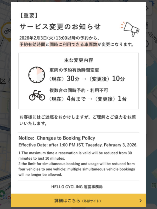 2026年2月3日(火) 13時に仕様変更し、車両予約有効時間を短縮するほか、