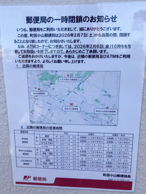 いずれも2026年2月27日(金)をもって一時閉鎖予定で、全国で一時閉鎖の郵便局が増えてきています。