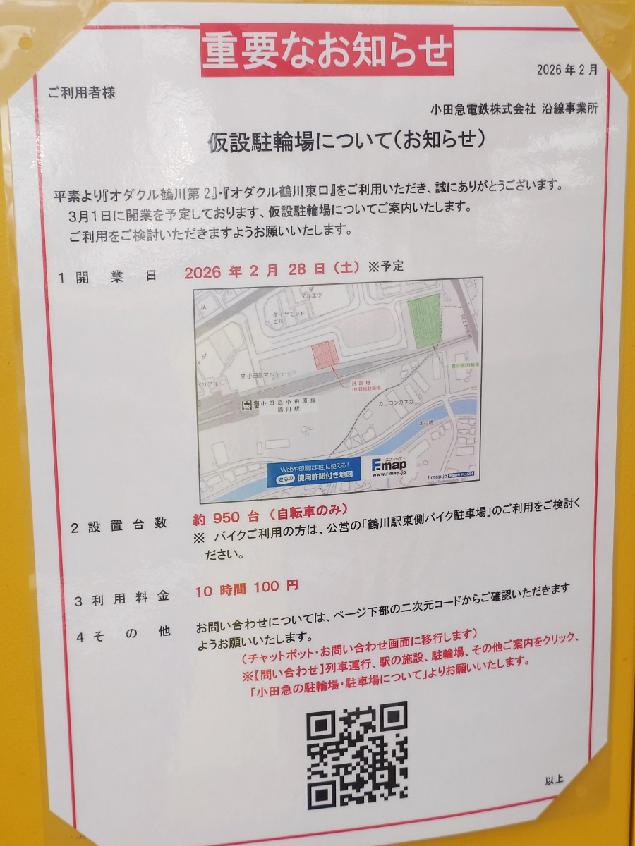 小田急電鉄では旧北口広場跡地の一部に「仮設駐輪場が、2026年2月28日(土)にオープン予定です。