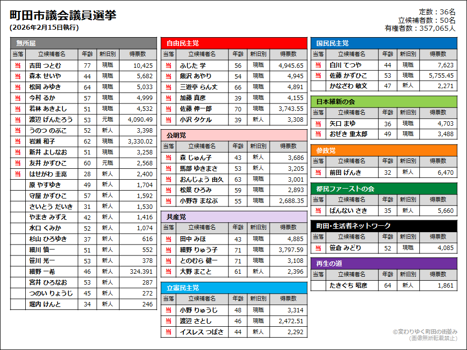 <画像>「町田市議会議員選挙」所属党派別・得票数一覧