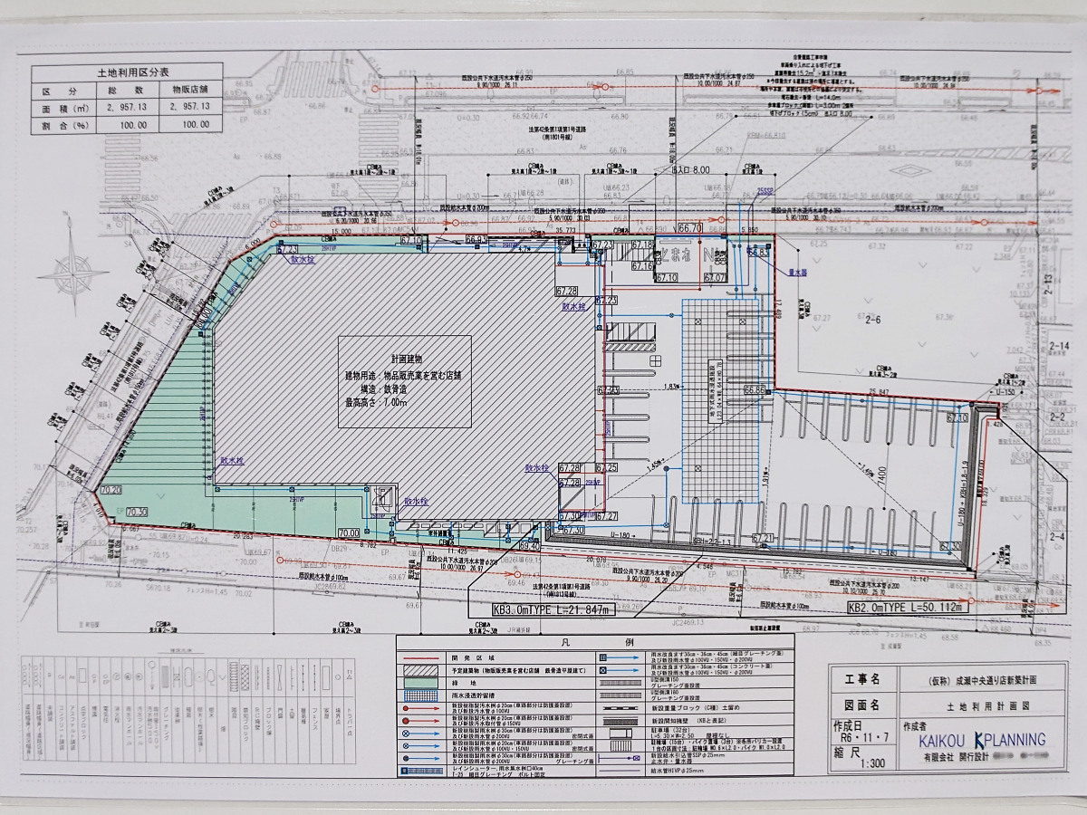 敷地面積2,957.13㎡の土地に建築面積1,193.61㎡、延べ面積1,136.32㎡の店舗を新築し、